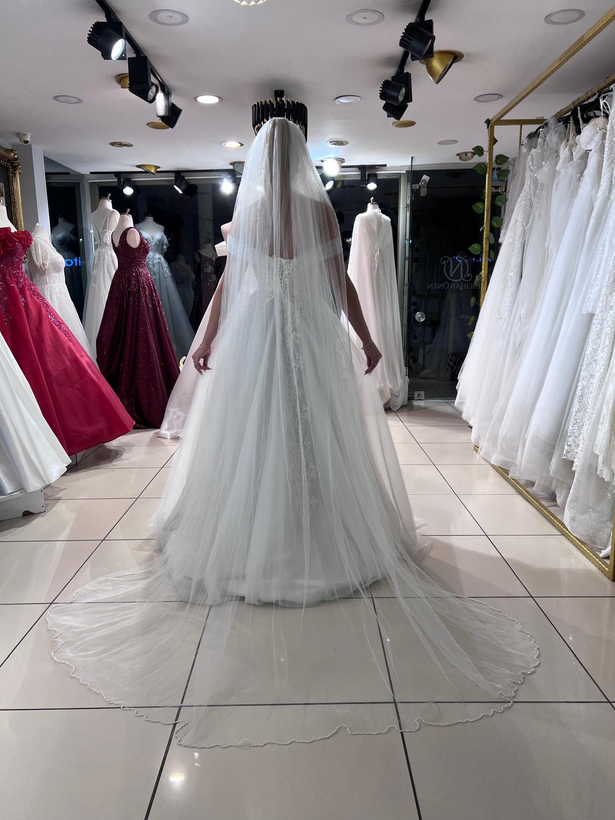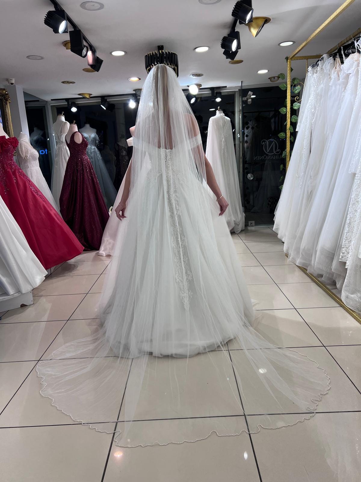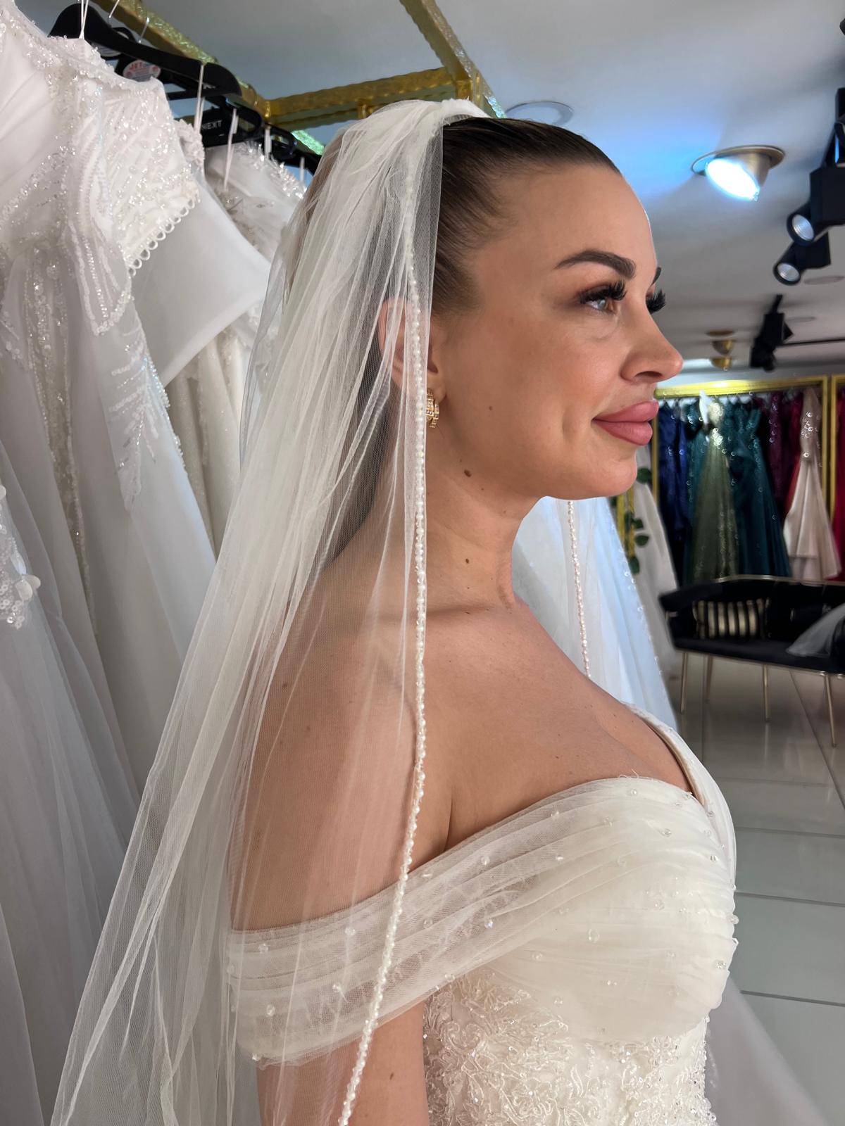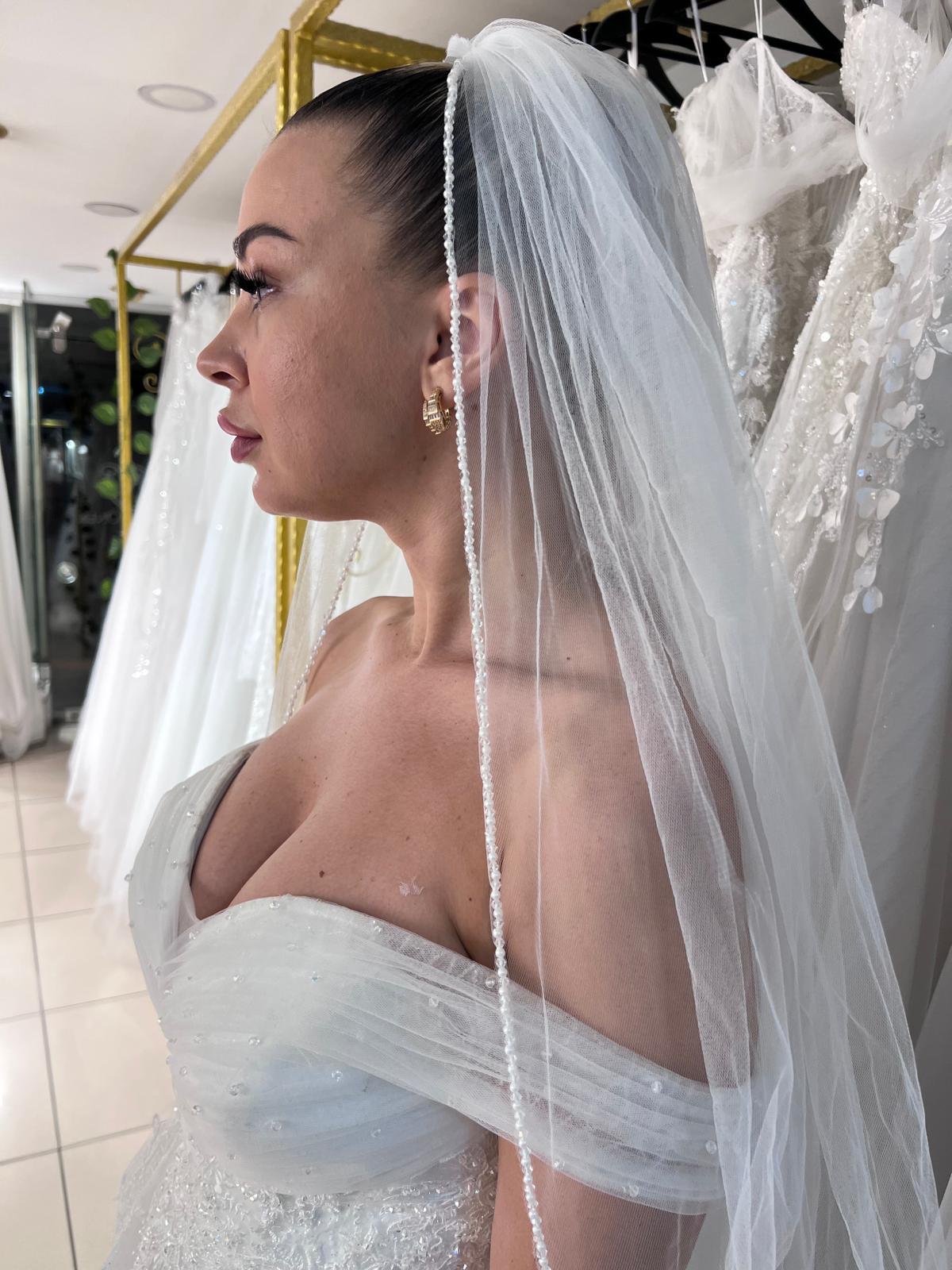 This elegant bridal veil is part of our 2024 collection, designed to accompany you on your special day. Crafted from 100% polyester, this veil is perfect for bringing together sophistication and elegance on your wedding day. If you aim to achieve a stylish and graceful look for your wedding, this veil is the perfect choice.