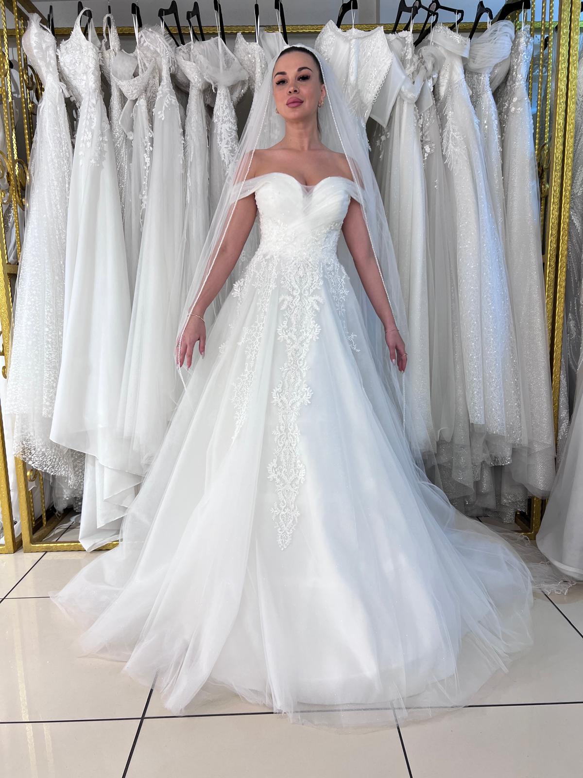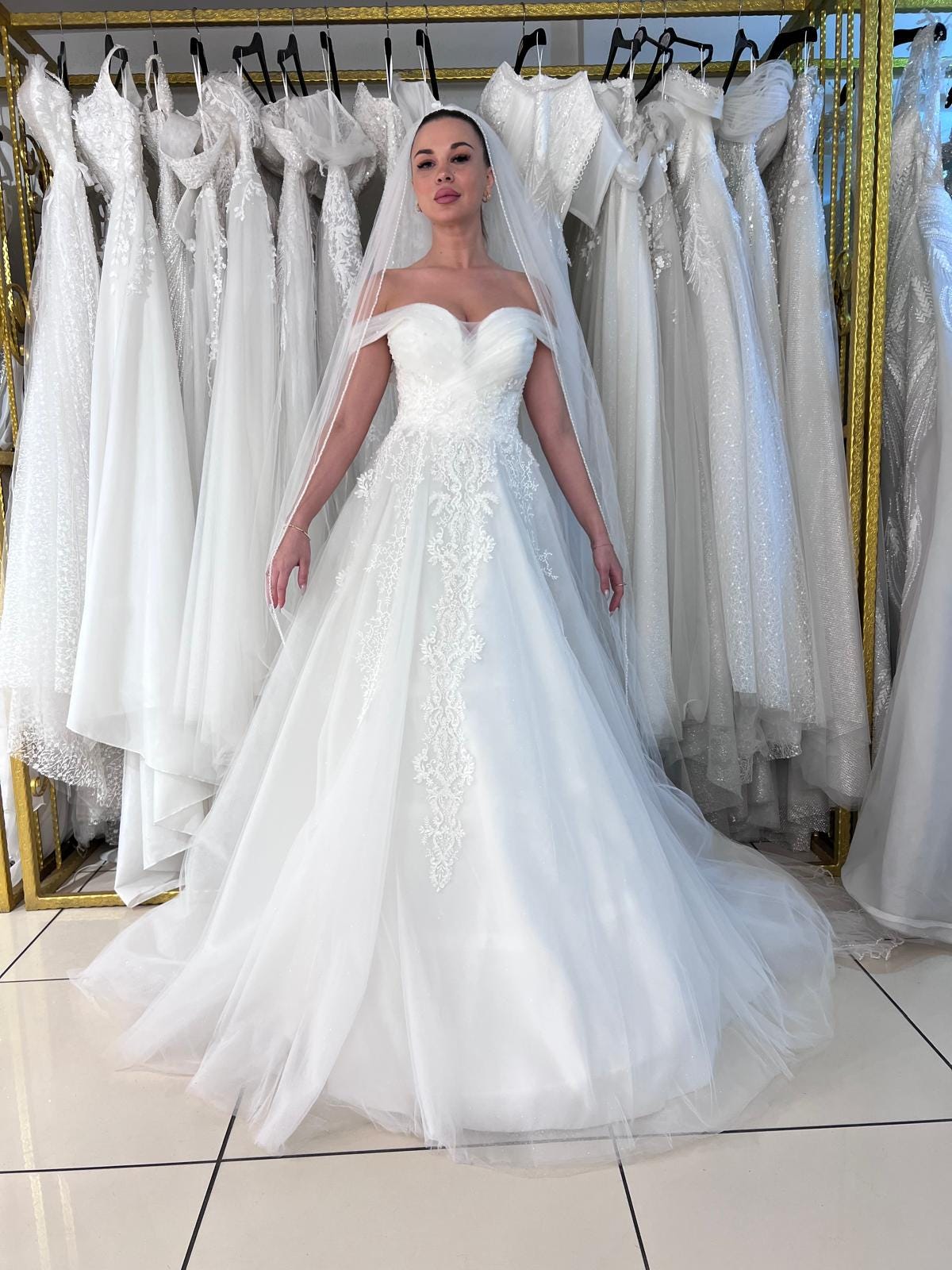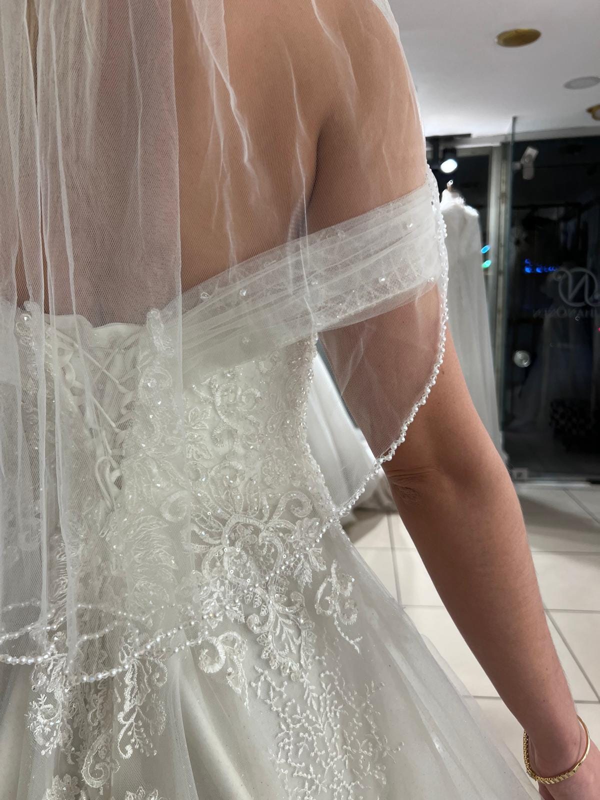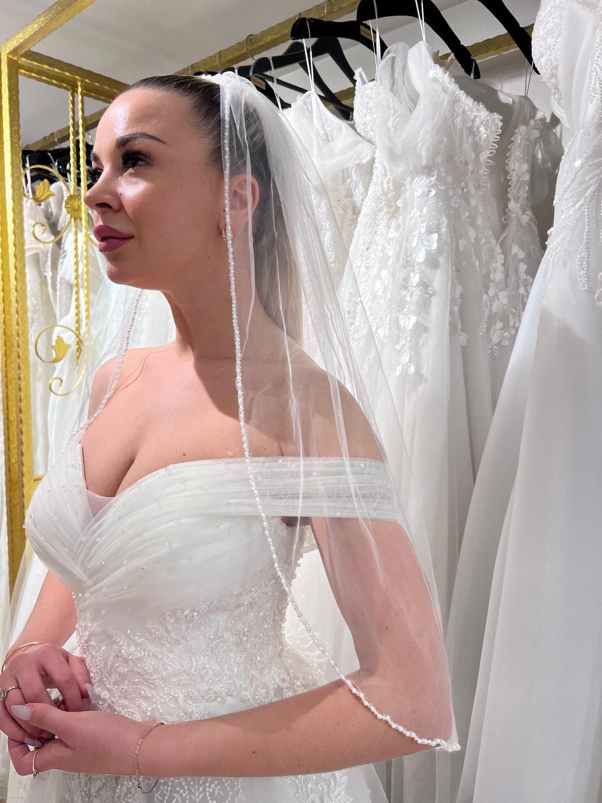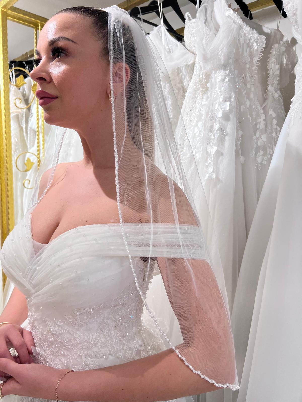 This elegant bridal veil is part of our 2024 collection, designed to accompany you on your special day. Crafted from 100% polyester, this veil is perfect for bringing together sophistication and elegance on your wedding day. If you aim to achieve a stylish and graceful look for your wedding, this veil is the perfect choice.